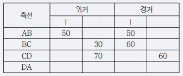 폐합트래버스 ABCD에서 각 측선의 경거, 위거가 표와 같을 때,