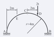 다음 그림과 같은 r=4m인 3힌지 원호아치에서 지점 A에서 2m 떨어진 E점의 휨모멘트의 크기는 약 얼마인가?
