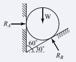 그림과 같이 밀도가 균일하고 무게가 W인 구(球)가 마찰이 없는 두 벽면 사이에 놓여 있을 때 반력