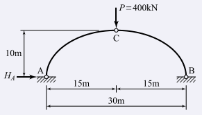 그림과 같은 3힌지 아치의 C점에 연직하중(