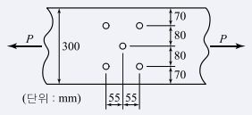 아래 그림과 같은 인장재의 순단면적은 약 얼마인가? (단, 구멍의 지름은 25mm이고, 강판두께는 10mm이다.)