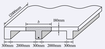 아래 그림과 같은 철근콘크리트 보-슬래브 구조에서 대칭 T형보의 유효폭(b)은?