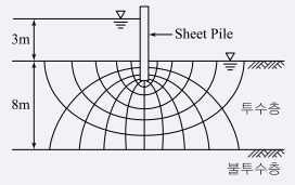 그림과 같은 지반내의 유선망이 주어졌을 때 폭 10m에 대한 침투 유량은? (단, 투수계수(K)는 2.2×10^{-2}cm/s이다.)