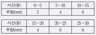 어떤 유역에 표와 같이 30분간 집중호우가 발생하였다. 지속시간 15분인 최대 강우 강도는?