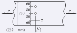 아래 그림과 같은 두께 12mm평판의 순단면적을 구하면? (단, 구멍의 직경은 23mm이다.)