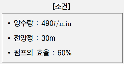 다음과 같은 조건에 있는 양수펌프의 축동력은?