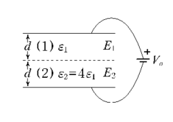 인 두 유전체를 반씩 채우고 극판 사이에 일정한 전압을 걸어줄 때 매질 (1), (2) 내의 전계의 세기