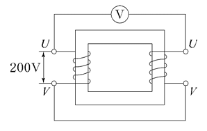 210/105[V]의 변압기를 그림과 같이 결선하고 고압측에 200[V]의 전압을 가하면 전압계의 지시는 몇 [V]인가? (단, 변압기는 가극성이다.)