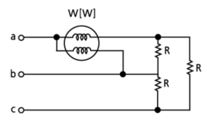 선간 전압이 V_{ab}[V]인 3상 평형 전원에 대칭부하 R[Ω]이 그림과 같이 접속되어 있을 때, a,b 두 상 간에 접속된 전력계의 지시 값이 W[W]라면 3상 전력은 몇 [W]인가?