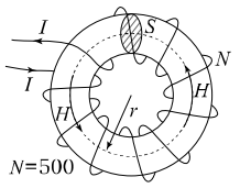 평균 반지름(r)이 20[cm], 단면적(S)이 6[cm²]인 환상 철심에서 권선수(N)가 500회인 코일에 흐르는 전류(I)가 4[A]일 때 철심 내부에서의 자계의 세기(H)는 약 몇 [AT/m]인가?
