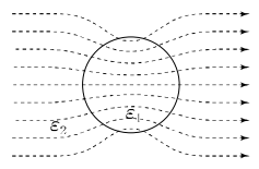 평등 전계 중에 유전체 구에 의한 전계 분포가 그림과 같이 되었을 때 \epsilon _1\epsilon _2의 크기 관계는?