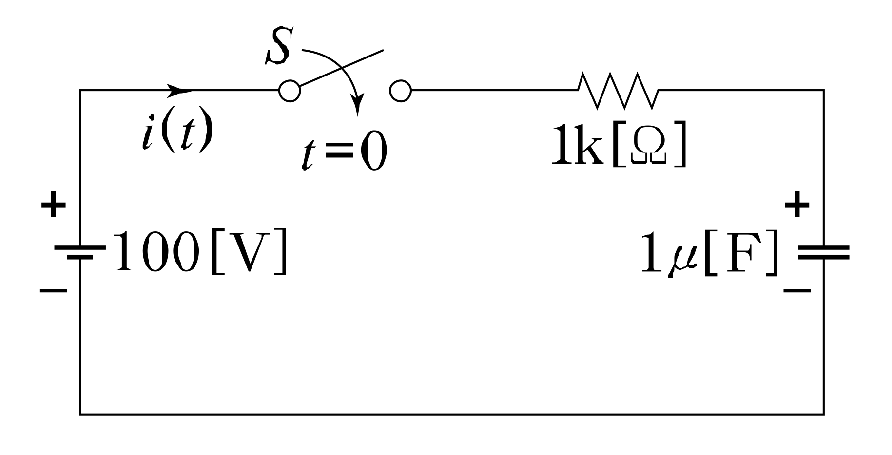 t=0에서 스위치(S)를 닫았을 때 t=0^+ 에서의 i(t)는 몇 A 인가? (단, 커패시터에 초기 전하는 없다.)