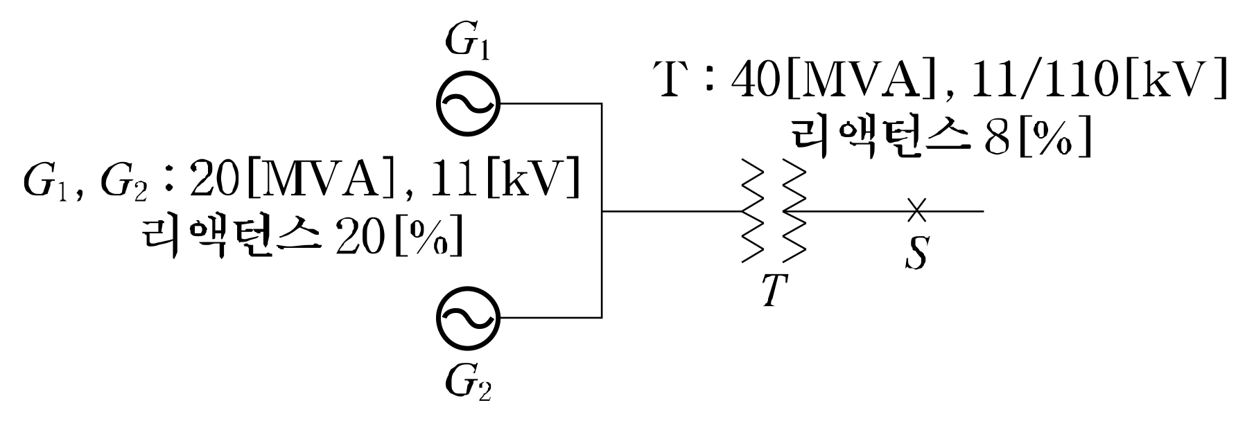 그림과 같은 송전계통에서 S점에 3상 단락사고가 발생했을 때 단락전류(A)는 약 얼마인가? (단, 선로의 길이와 리액턴스는 각각 50㎞, 0.6\Omega/㎞이다.)