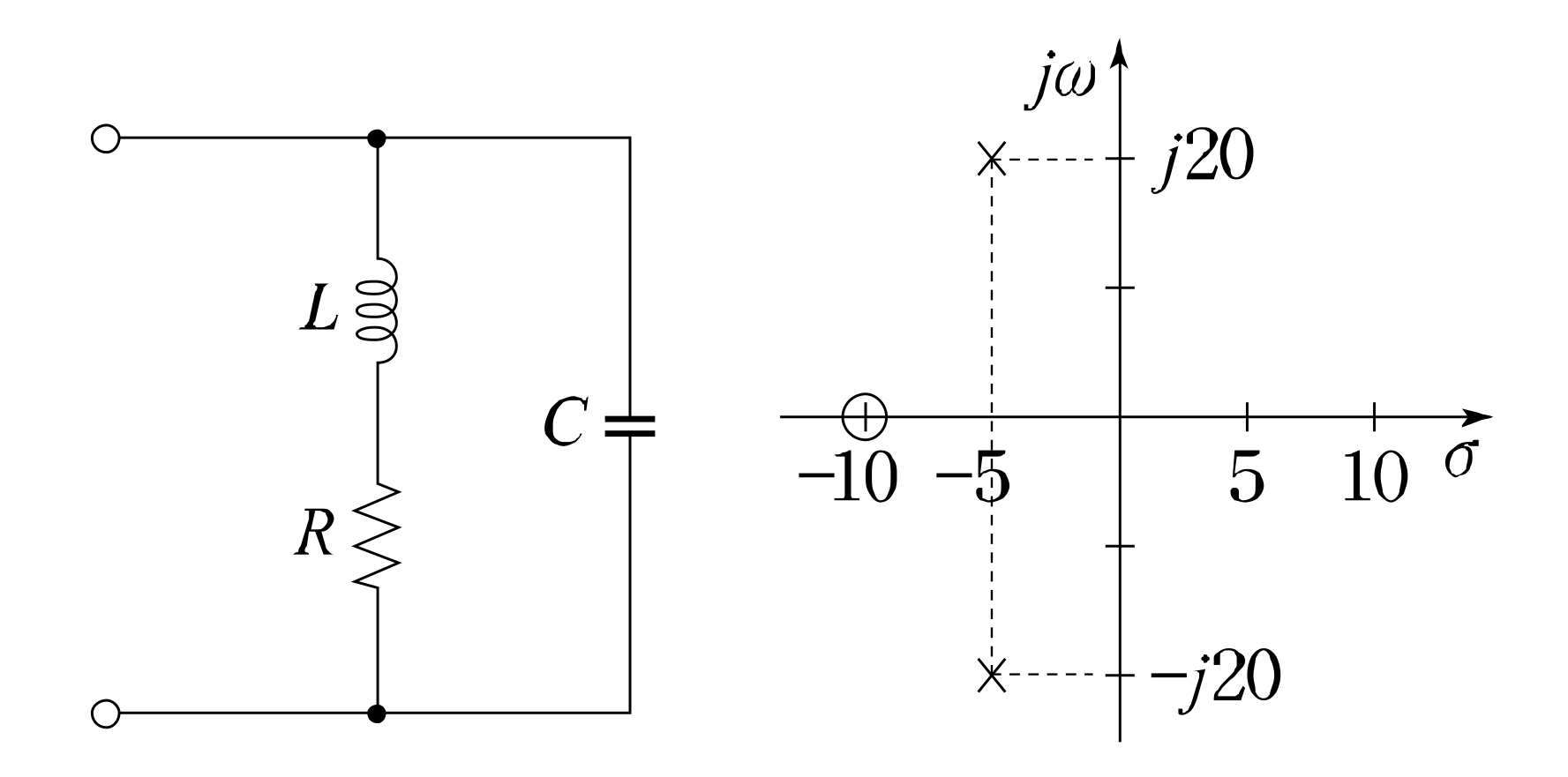 와 같은 회로에 대한 구동점 임피던스의 극점과 영점이 각각 그림