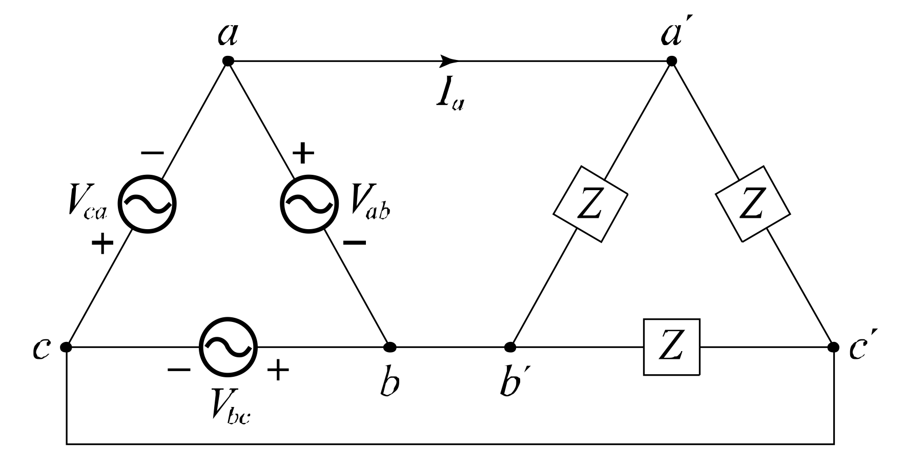 그림과 같은 평형 3상회로에서 전원 전압이 V_{ab}=200(V)이고 부하 한상의 임피던스가 Z=4+j3(\Omega)인 경우 전원과 부하사이 선전류 I_a는 약 몇 A인가?