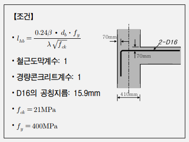 다음 그림과 같이 D16철근이 90˚표준갈고리로 정착 되었다면 이 갈고리의 소요정착길이(l_{hb})는 약 얼마인가?