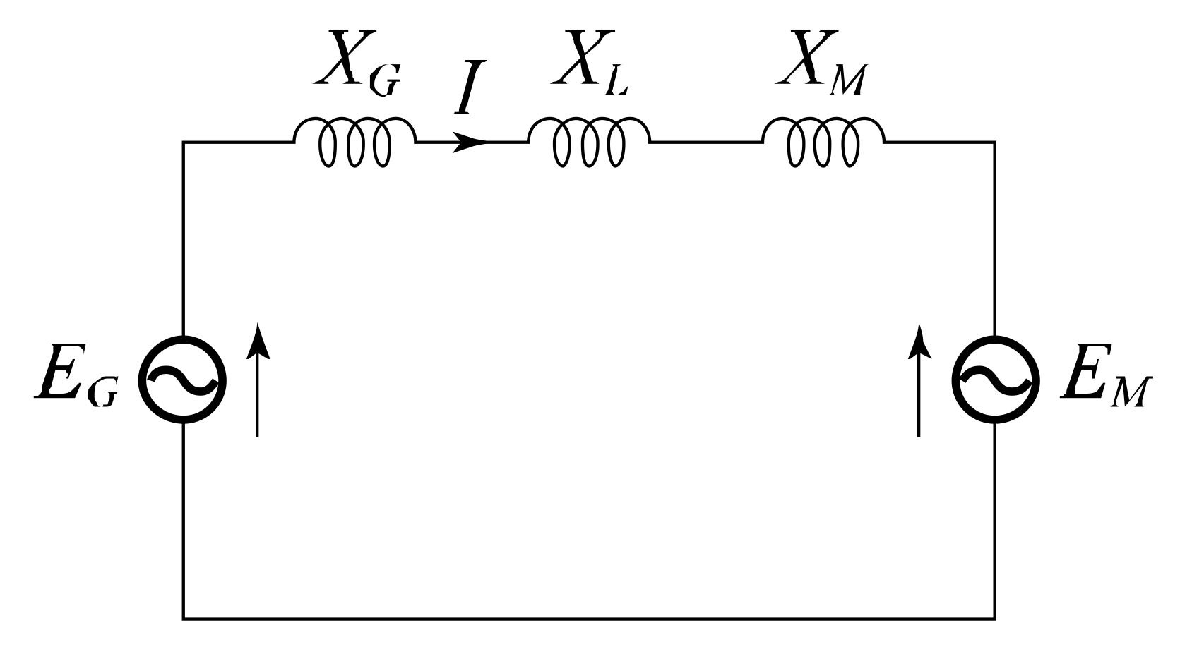그림과 같은 2기 계통에 있어서 발전기에서 전동기로 전달 되는 전력 P는? (단,