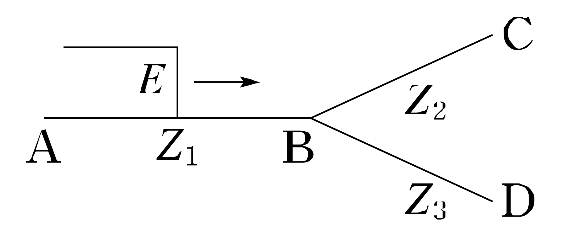 임피던스 Z_1,Z_2Z_3 을 그림과 같이 접속한 선로의 A쪽에서 전압파 E가 진행해 왔을 때 접속점 B에서 무반사로 되기 위한 조건은?