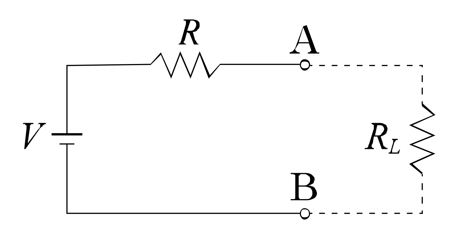 그림과 같이 전압 V와 저항 R로 구성되는 회로 단자 A-B간에 적당한 저항 R_L을 접속하여 R_L에서 소비되는 전력을 최대로 하게 했다. 이 때 R_L에서 소비되는 전력 P는?