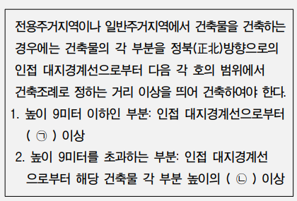 일조 등의 확보를 위한 건축물의 높이 제한 기준 중 ㉠과 ㉡에 해당하는 내용이 옳은 것은?