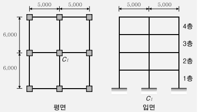 그림과 같은 지상 4층 건물에 기둥 C_11층에 발생하는 계수하중에 따른 축력을 면적법으로 구하면? (단, 보 및 기둥 자중은 무시하며, 바닥하중(지붕하중 동일)은 고정하중은 5 \mathrm{kN} / \mathrm{m}^2, 활하중 3 \mathrm{kN} / \mathrm{m}^2이며 활하중 저감은 무시한다.)
