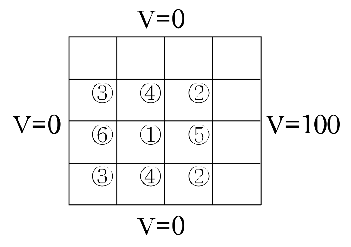 그림과 같은 정방형관 단면의 격자점 ⑥의 전위를 반복법으로 구하면 약 몇 V 인가?