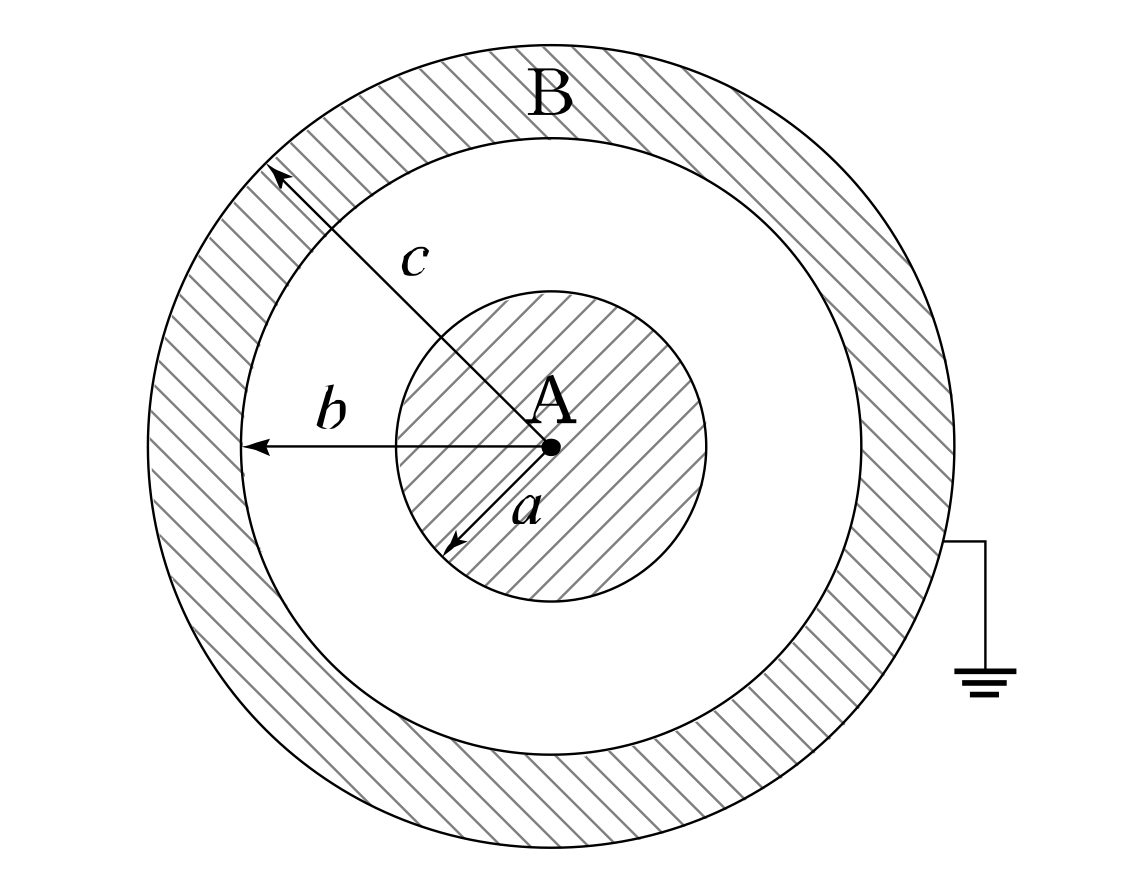 그림과 같이 공기 중 2개의 동심 구도체에서 내구(A)에만 전하 Q를 주고 외구(B)를 접지하였을 때 내구(A)의 전위는?