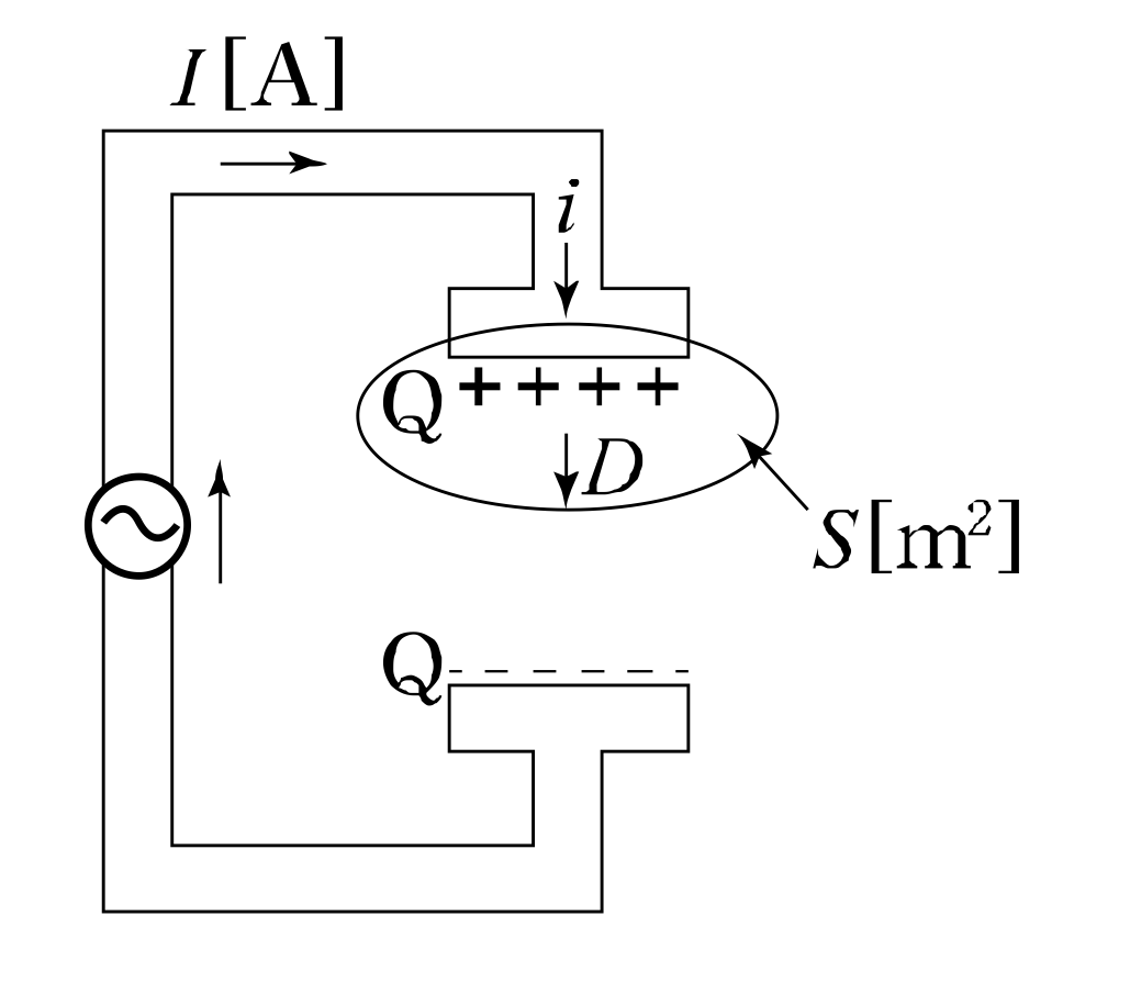 그림과 같이 평행판 콘덴서에 교류전원을 접속할 때 전류의 연속성에 대하여 성립하는 식은?
