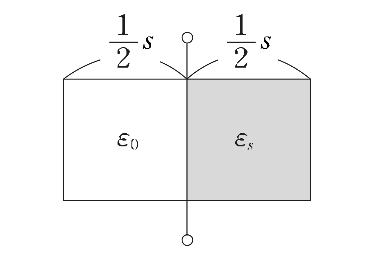 그림과 같이 정전용량이 C_0[F]가 되는 평행판 공기 콘덴서에 판면적의 \frac{1}{2} 되는 공간에 비유전률이 ε_s인 유전체를 채웠을 때 정전용량은 몇 [F] 인가?