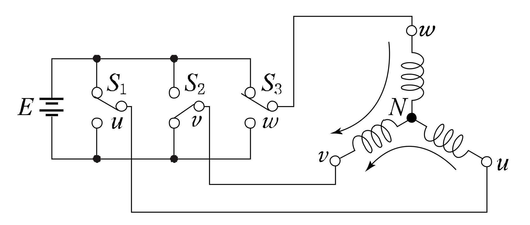 그림과 같이 180° 도통형 인버터의 상태일 때 u상과 v상의 상전압 및 u-v 선간전압은?