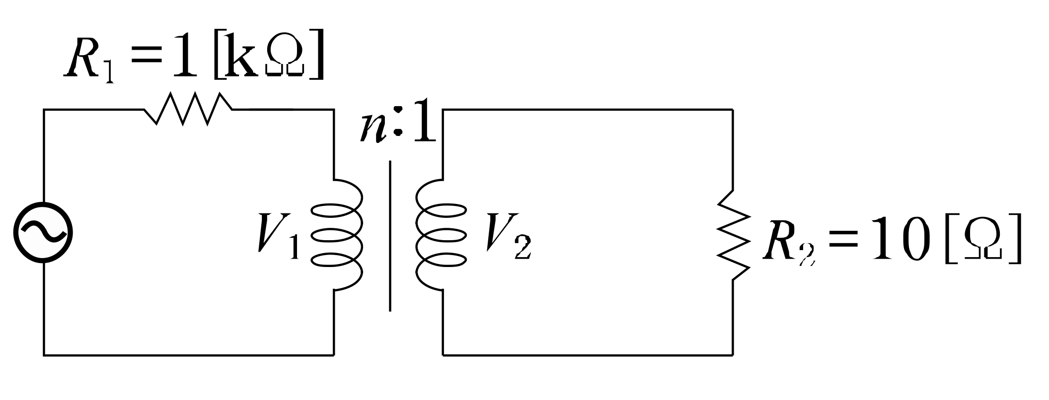 전원측 저항 1kΩ, 부하저항 10Ω 일 때, 이것에 변압비 n:1의 이상 변압기를 사용하여 정합을 취하려 한다. n의 값으로 옳은 것은?