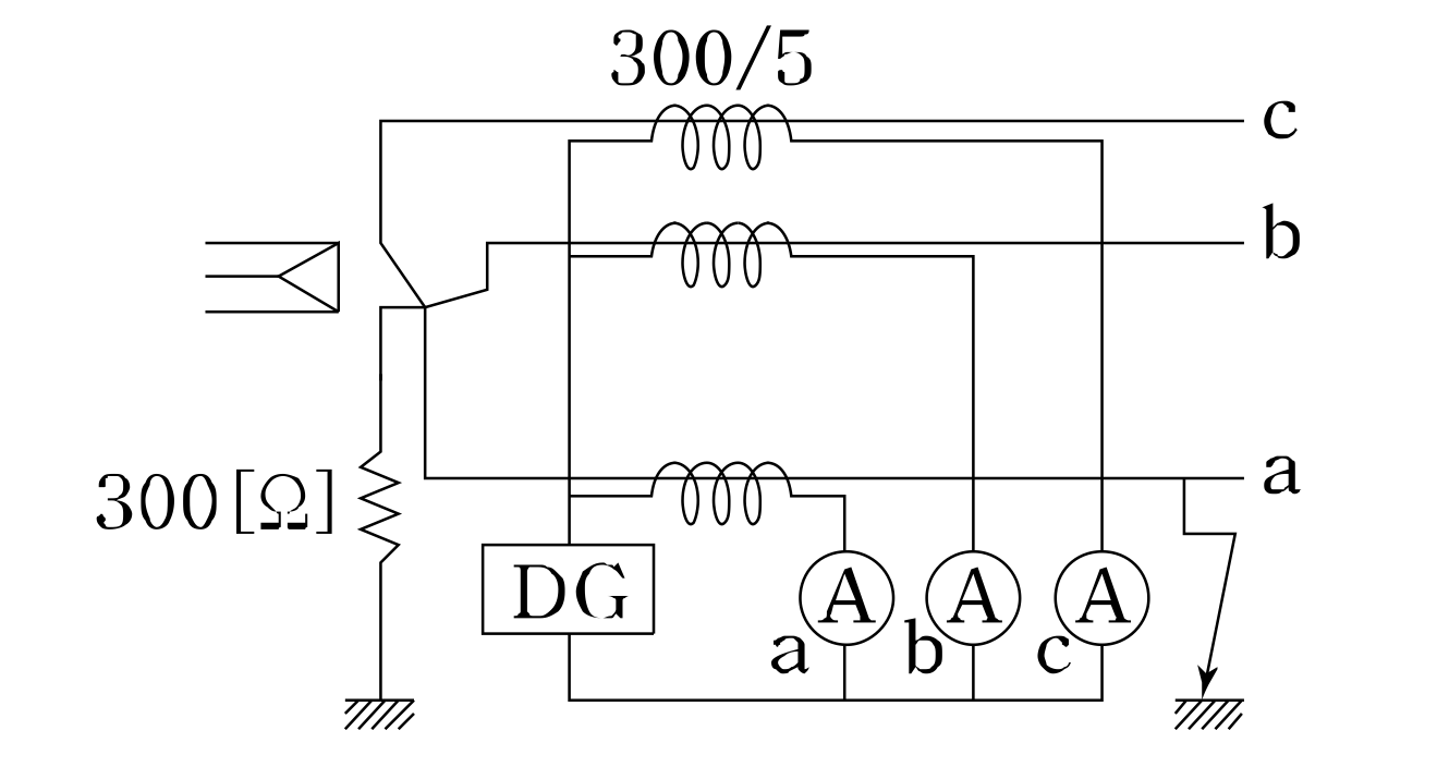 일 때 a상에 완전 지락사고가 발생하였다. 지락 계전기 DG에 흐르는 전류는 약 몇