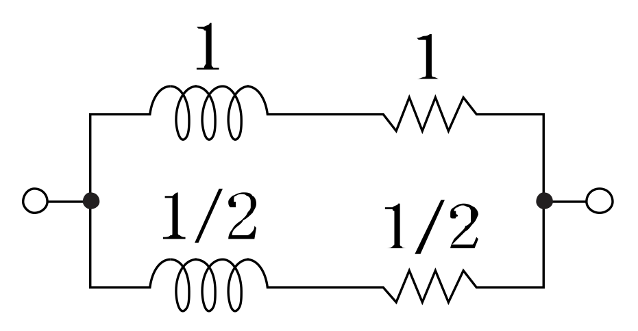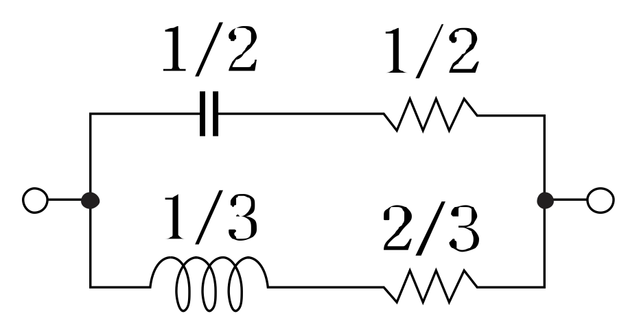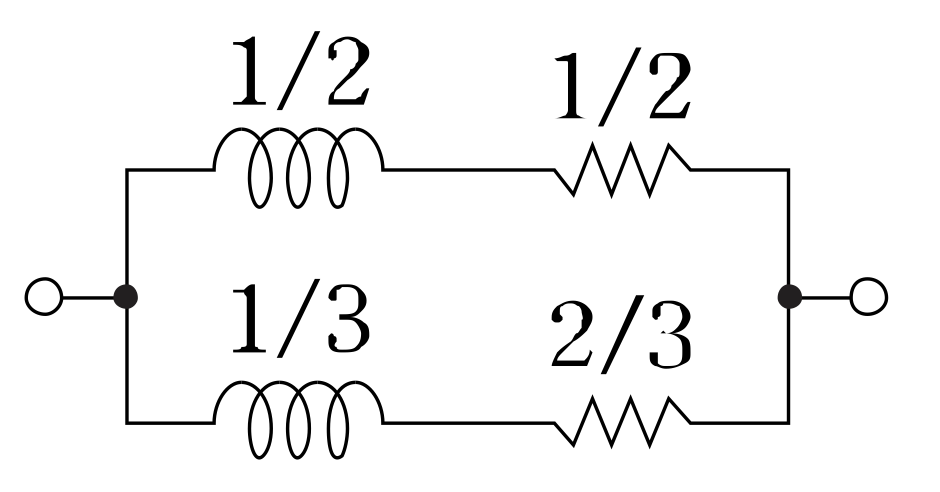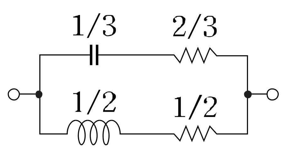 어떤 2단자 회로에 단위 임펄스 전압을 가할 때 2e^{-t}+3e^{-2t}[A]의 전류가 흘렀다. 이를 회로로 구성하면? (단, 각 소자의 단위는 기본 단위로 한다.)