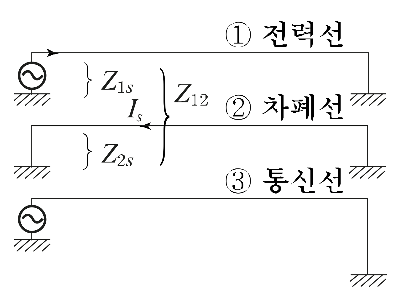 전력선과 통신선 사이에 그림과 같이 차폐선을 설치하며, 각 선사이의 상호임피던스를 각각