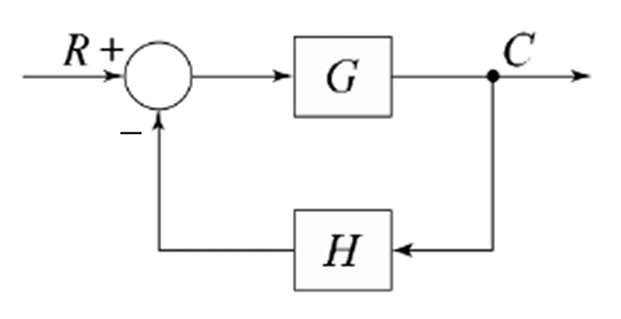 그림과 같은 폐루프 전달함수 T= \frac{C}{R} 에서 H에 대한 감도 S_H^T 는?