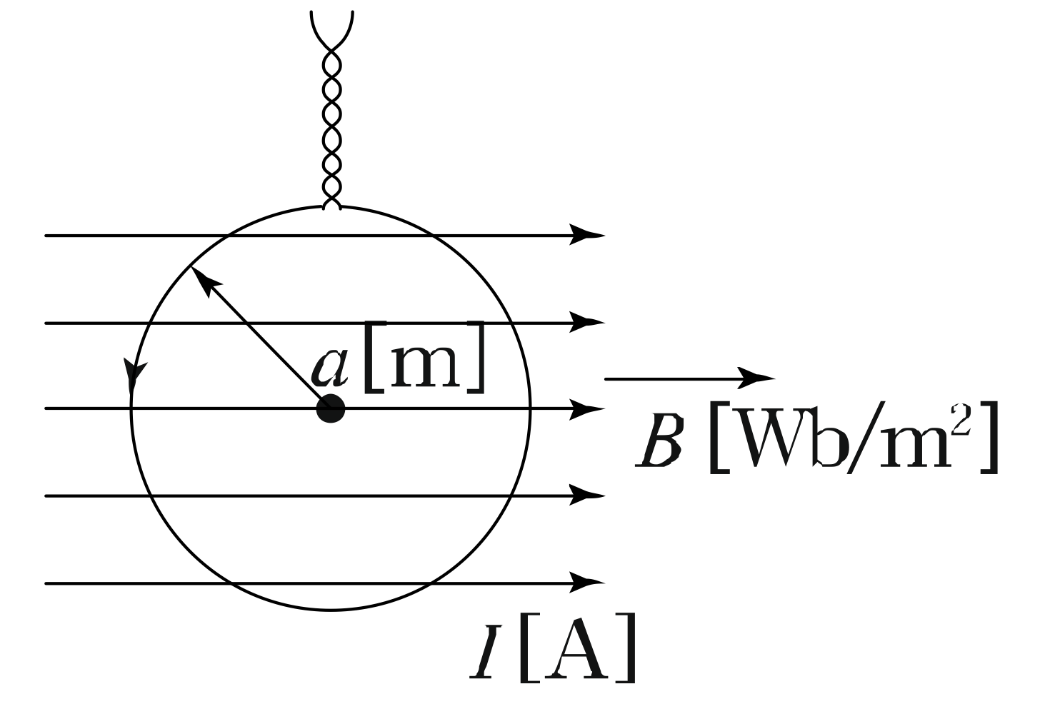 그림과 같이 반지름 a[m]의 한번 감긴 원형 코일이 균일 한 자속밀도 B[Wb/m^2] 인 자계에 놓여있다. 지금 코일 면을 자계와 나란하게 전류 I[A]를 흘리면 원형코일이 자계로부터 받는 회전 모멘트는 몇 [N\cdot m/rad]인가?