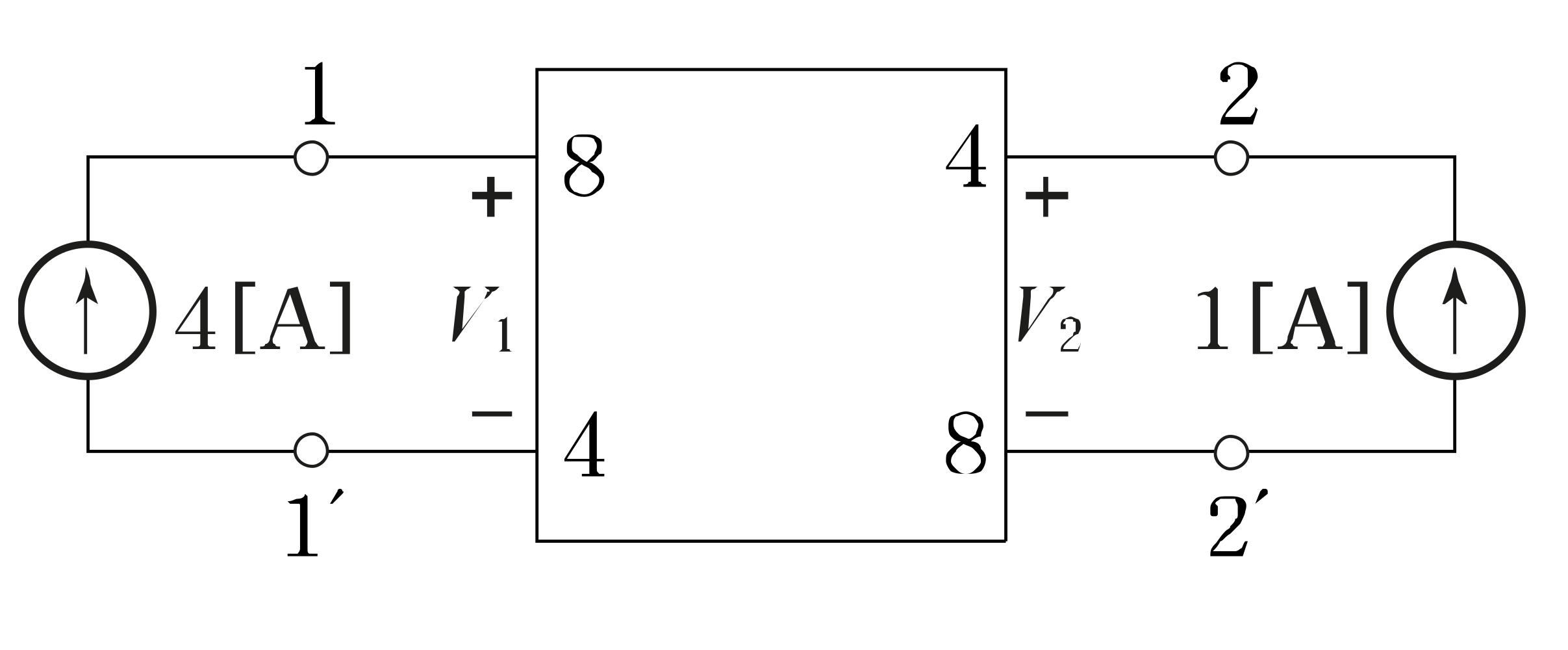 다음과 같은 Z파라미터로 표시되는 4단자망의 1-1' 단자간에 4[A], 2-2‘ 단자 간에 1[A]의 정전류원을 연결하였을 때의 1-1‘ 단자간의 전압 V_1과 2-2’간의 전압 V_2가 바르게 구하여진 것은? (단, Z 파라미터는 단위는 [Ω]이다.)