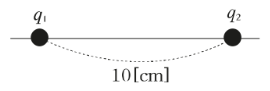 그림과 같이 q_1=6 \times 10^{-8}[C], q_2=-12\times 10^{-8}[C]의 두 전하가 서로 10[cm] 떨어져 있을 때 전계세기가 0이 되는 점은?