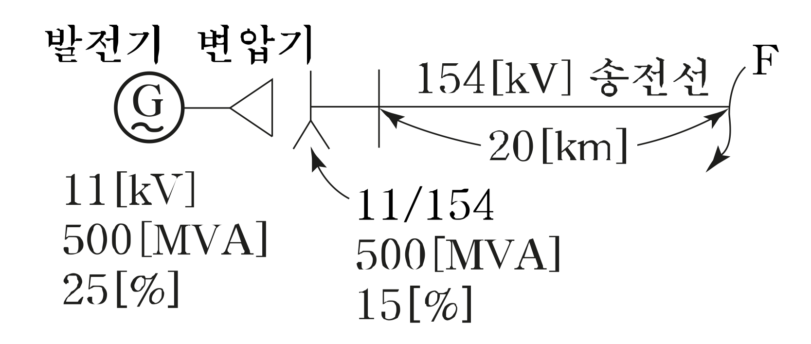 그림의 F점에서 3상 단락 고장이 생겼다. 발전기 쪽에서 본 3상 단락전류는 몇 [kA]가 되는가? (단, 154[kV] 송전선의 리액턴스는 1,000[MVA]를 기준으로 하여 2[\%/km]이다.)