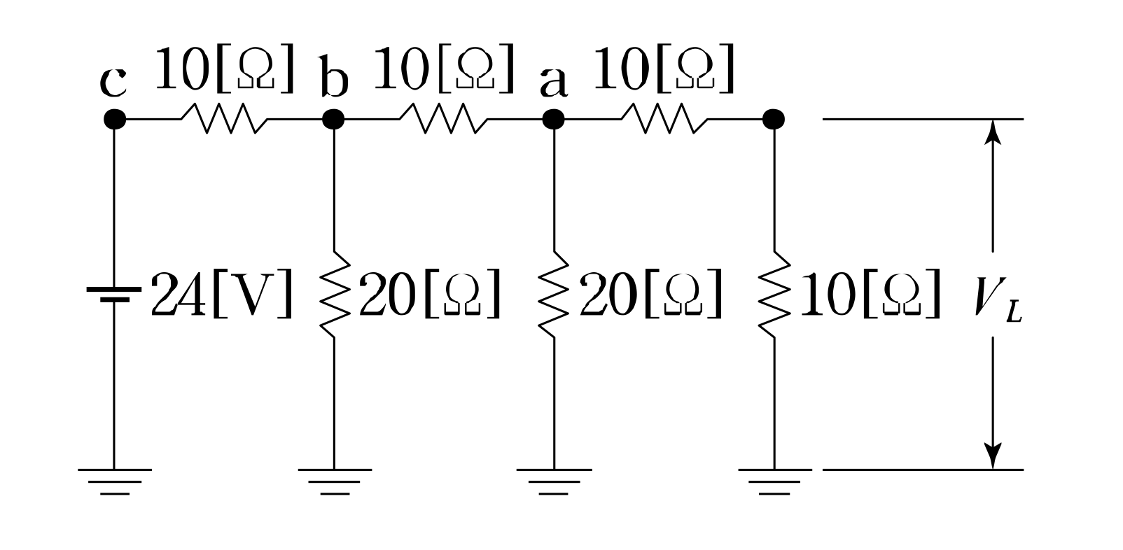 그림의 사다리꼴 회로에서 부하전압 V_L 의 크기 [V] 는?