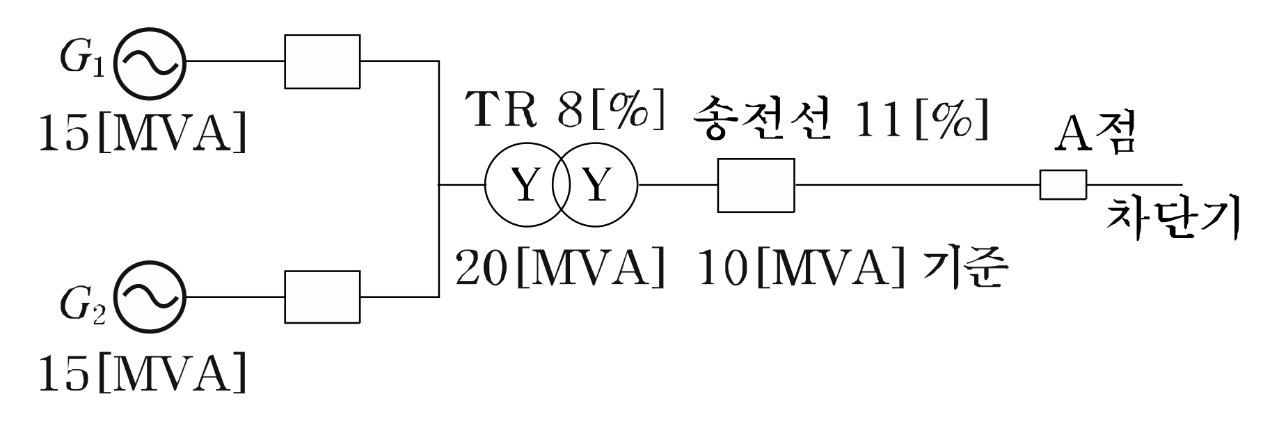그림과 같은 전력계통에서 A점에 설치된 차단기의 단락 용량은 몇