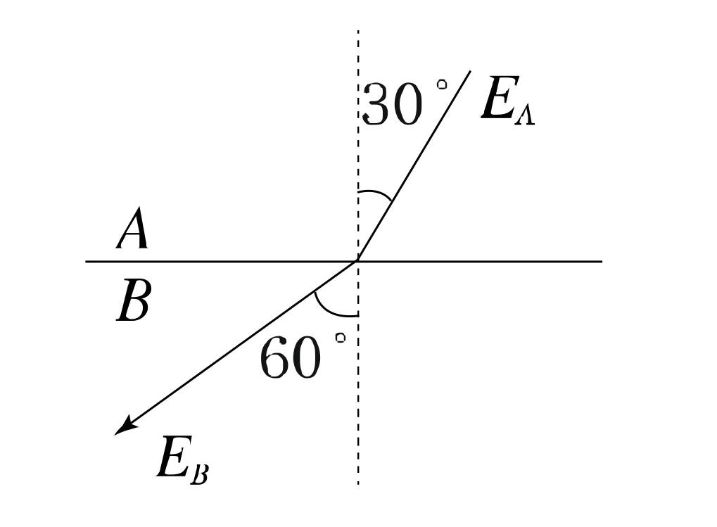 유전체 A, B의 접합면에 전하가 없을 때, 각 유전체 중 전계의 방향이 그림과 같고