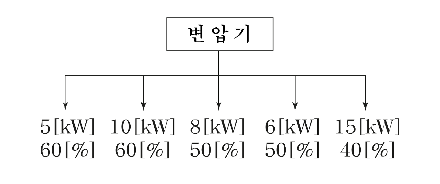 그림과 같은 수용설비용량과 수용률을 갖는 부하의 부등률이 1.5이다. 평균부하 역률을 75%라 하면 변압기 용량은 약 몇 [kVA]인가?