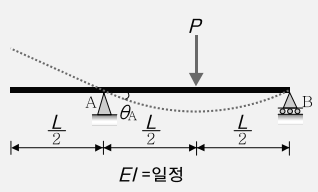 그림과 같은 내민보에 집중하중이 작용할 때 \rm A점의 처짐각 \theta_A 를 구하면?