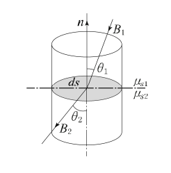 그림과 같이 비투자율이 \mu_{s1}, \mu_{s2}인 각각 다른 자성체를 접하여 놓고 \theta_1을 입사각이라 하고, \theta_2를 굴절각이라 한다. 경계면에 자하가 없는 경우 미소 폐곡면을 취하여 이곳에 출입하는 자속수를 구하면?