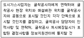 도시가스 배관의 안전초지 및 손상방지를 위해 다음과 같이 안전초지를 하여야하는데 굴착공사자는 굴착공사 예정지역의 위치에 어떤 조치를 하여야 하는가?