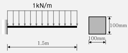 길이 1.5m이고, 한 변이 100mm인 정사각형 단면을 가지고 있는 캔틸레버보의 최대휨응력과 최대처짐은?