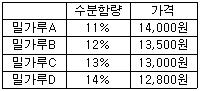 밀가루 A, B ,C ,D 네 가지 제품의 수분함량과 가격이 아래 표와 같을 때 고형분에 대한 단가를 고려하여 어떤 밀가루를 사용하는 것이 가장 경제적인가?