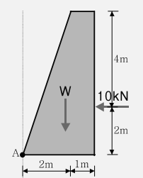 그림과 같은 옹벽에 토압이 10kN이 가해지는 경우 이 옹벽이 전도되지 않기 위해서는 어느 정도의 자중(自重)을 필요로 하는가?