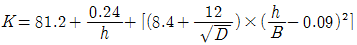 직각 3각 웨어에서 웨어의 수두 0.2m, 수로폭 0.5m, 수로의 밑면으로부터 절단 하부점 까지의 높이 0.9m일 때, 아래의 식을 이용하여 유량(m^3/min)을 구하면?